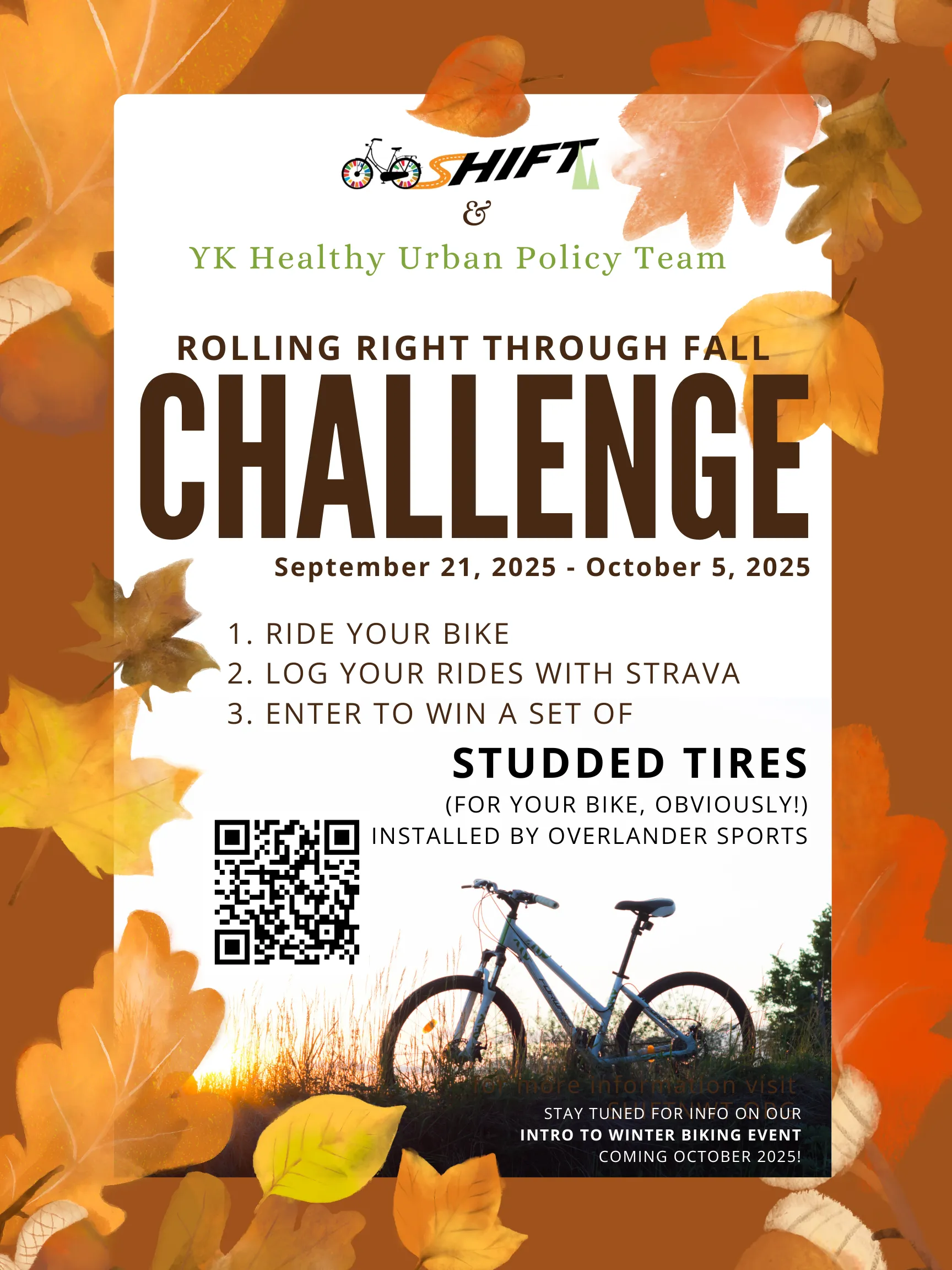 Congratulations to Kirsten D-L, the lucky winner of a set of studded tires from our Rolling Right Through Fall challenge! Thanks go to Overlander Sports as well as the YK Healthy Urban Policy Team for their support.