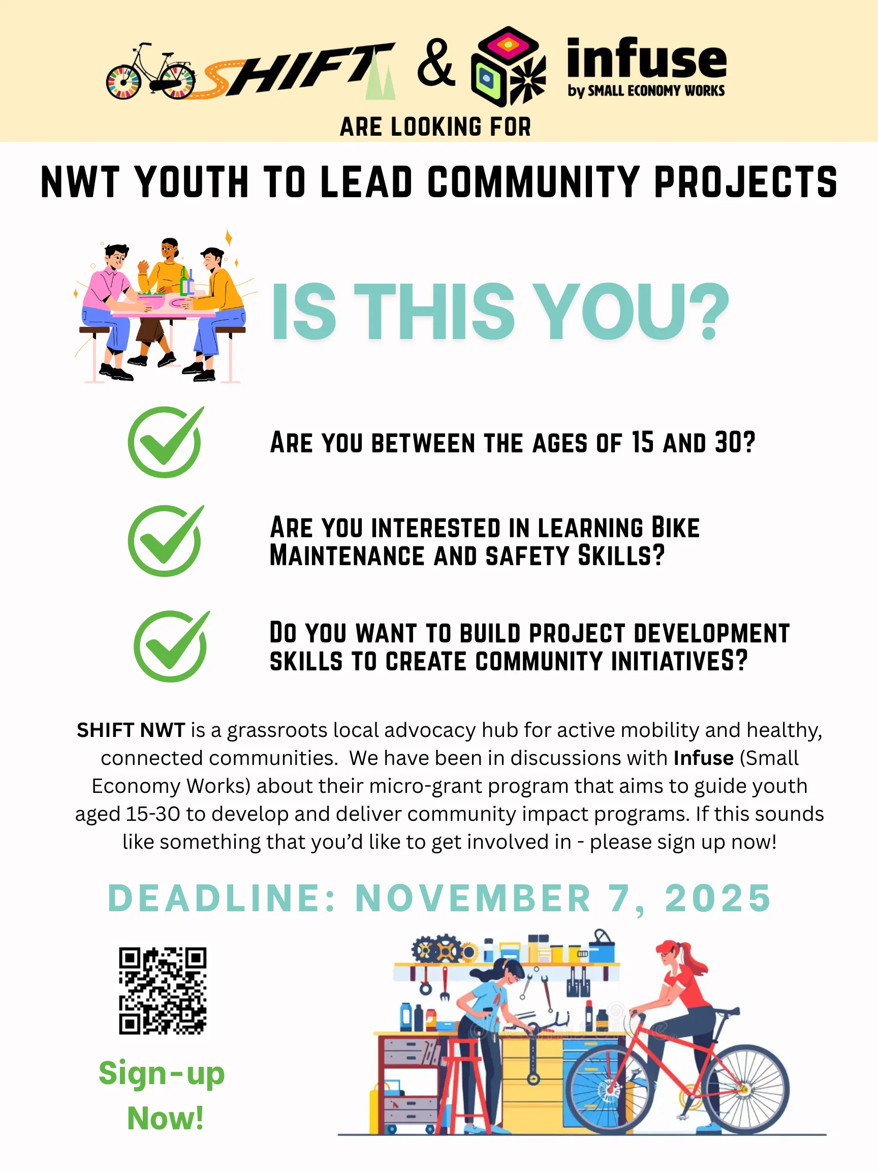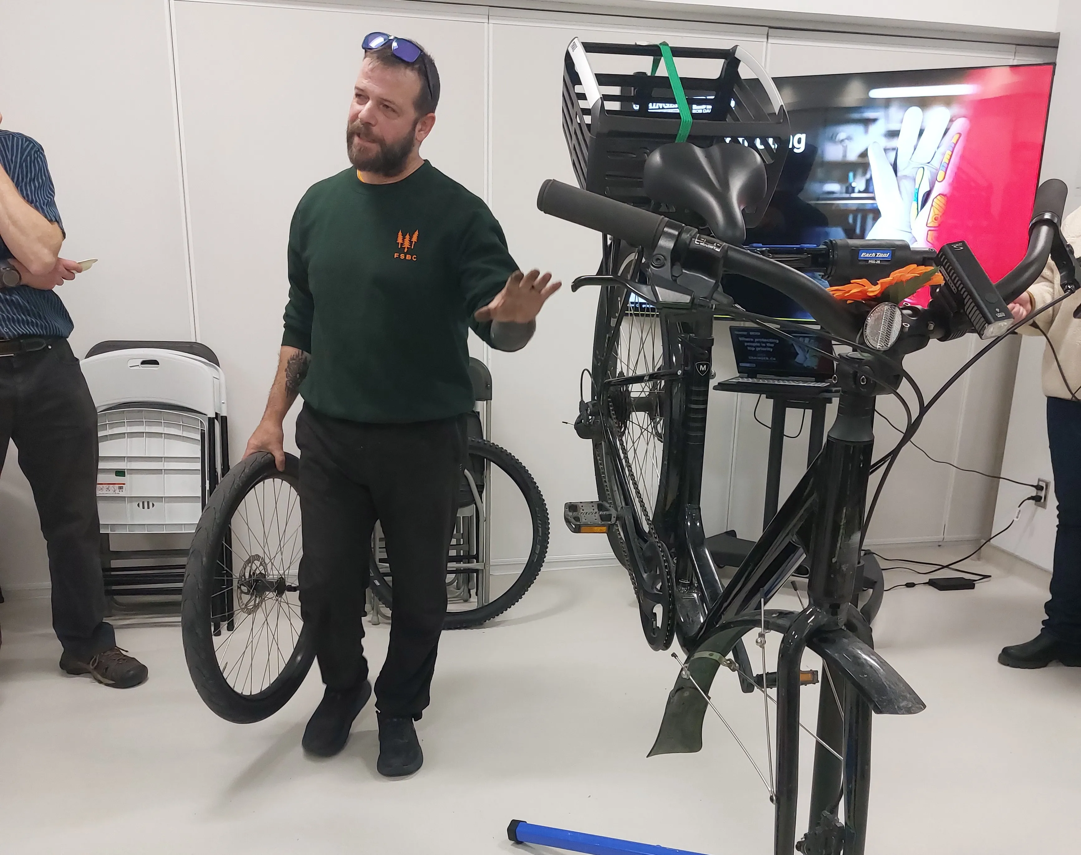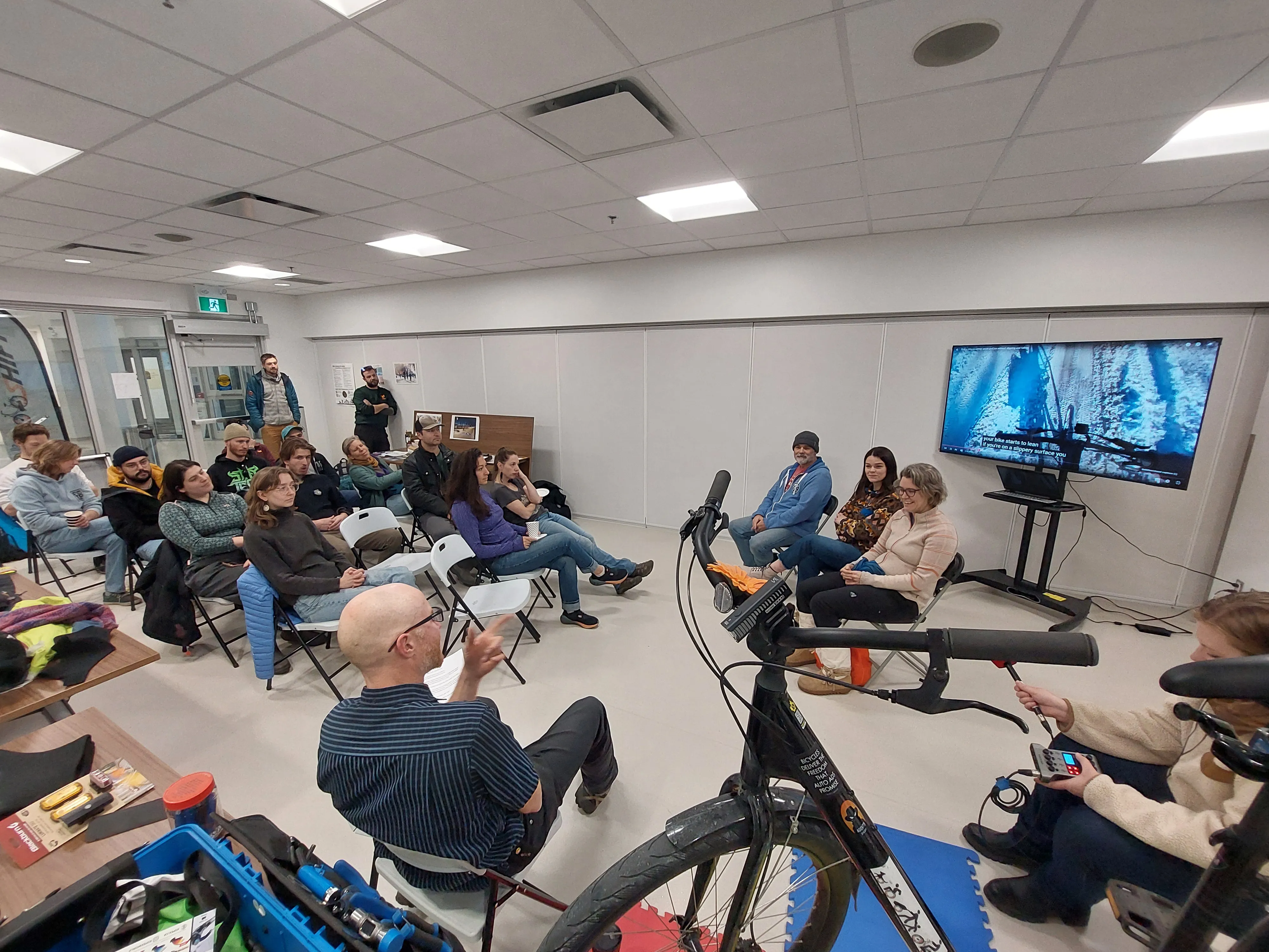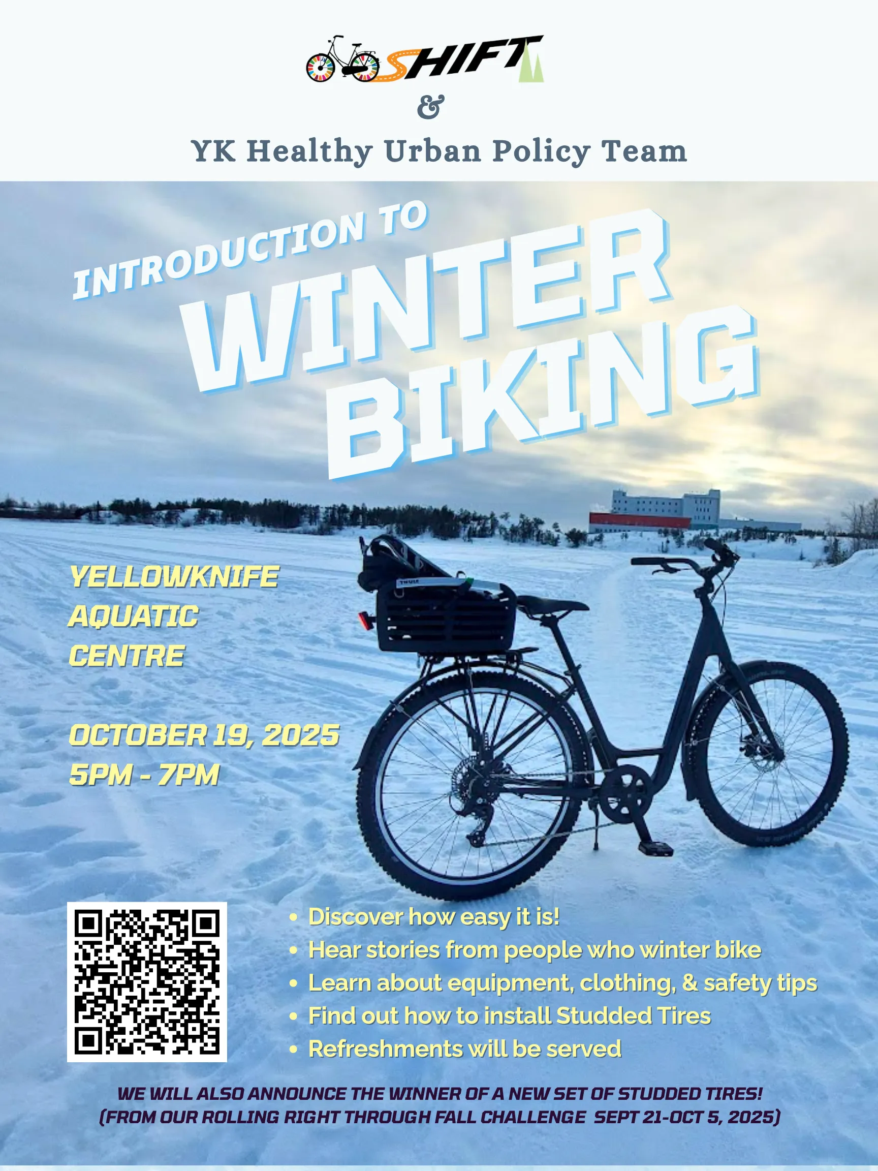 SHIFT NWT's Introduction to Winter Cycling event on October 19, 2025 was a ton of fun! Becca Denley set the agenda and did the intro, then we had a nice panel discussion led by Dwayne Wohlgemuth, a good winter bike maintenance presentation and studded tire install demo by Mike from Overlander Sports, plenty of opportunities to ask questions, and lots of snack!