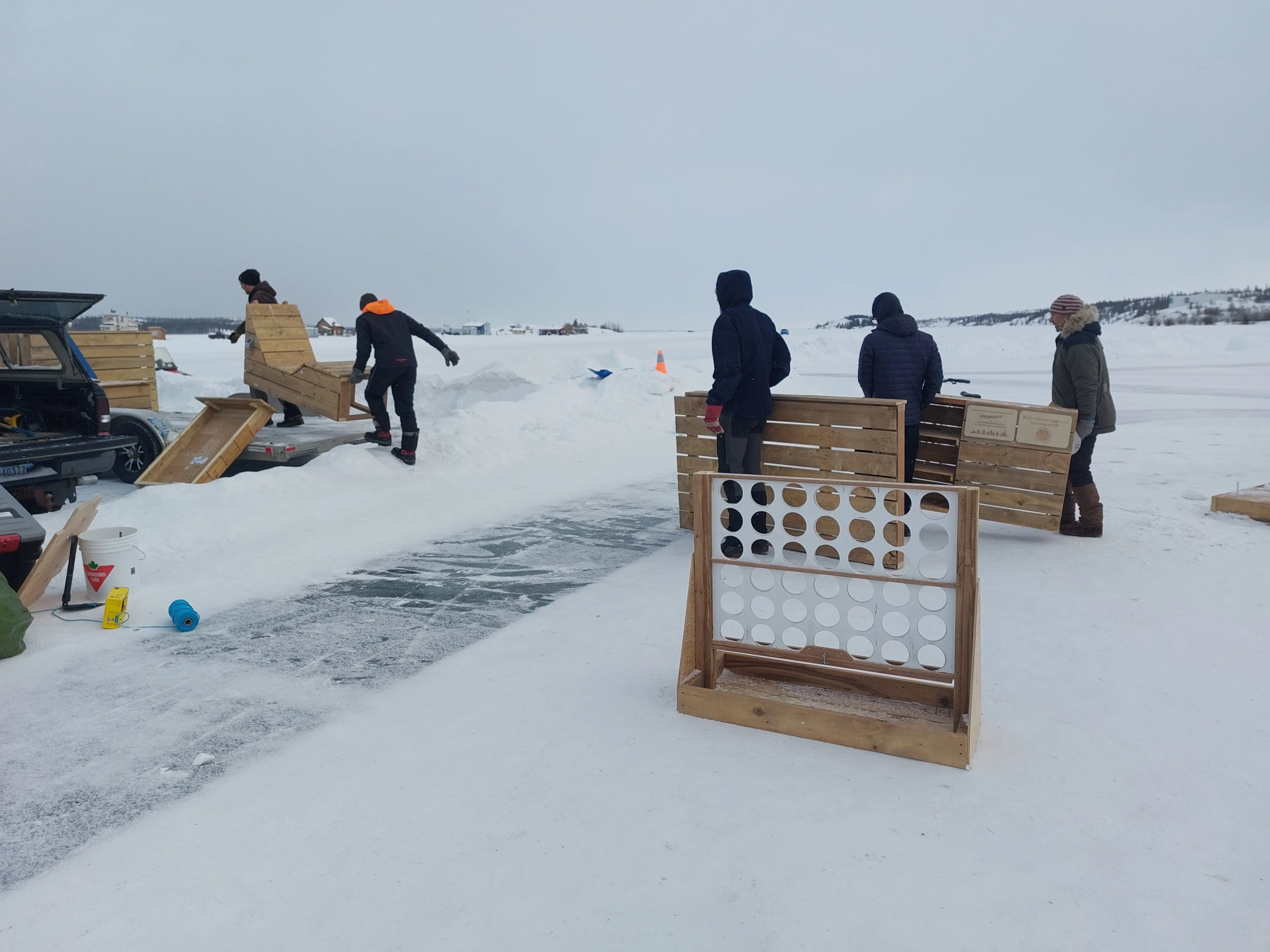 Now you see it, now you don't! The SnowKings Winter Festival has come to a close, which means the parklet has been packed up. After placing the parklet next to the Snow Castle on March 1, 2026, it took on a life of its own; sometimes the venue of organized events, but mostly an invitation to sit, contemplate, marvel at the castle and sculptures, or have an impromptu game of connect 4 with a stranger. We received some great comments in our guest book and saw a collection of books come and go in the free library. Other than some spilled hot chocolate, it's no worse for wear. The parklet is now in storage until the snow melts and then it will spend the summer livening up one of our downtown Yellowknife streets. We look forward to witnessing its next life in a summer setting, and wonder what natural activations it will see...